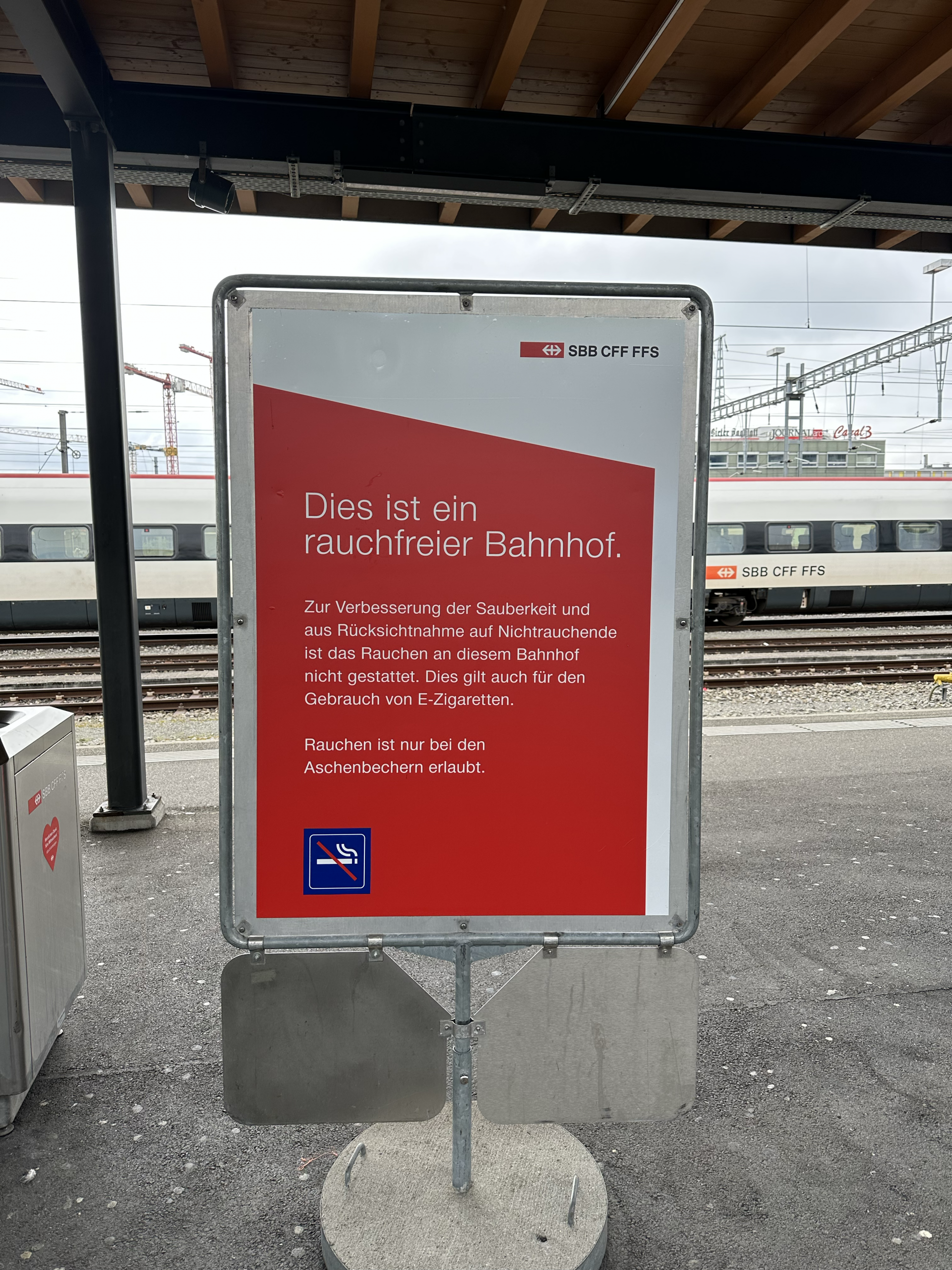 “In order to improve the cleanliness and out of respect to the non-smokers, smoking at this train station is not allowed. This also includes smoking e-cigarettes. Smoking is only allowed by the ash containers.”